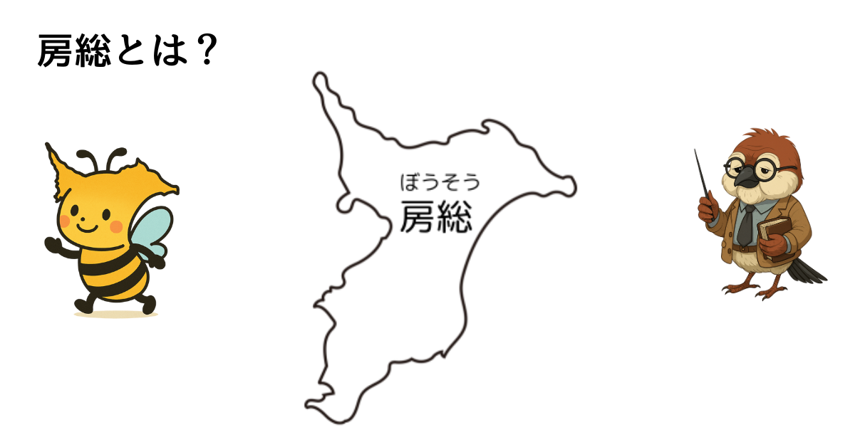 むかし、千葉県は3つの国に分かれていたのじゃ。その安房と上総、下総から2字をとって房総と名づけたのじゃ!