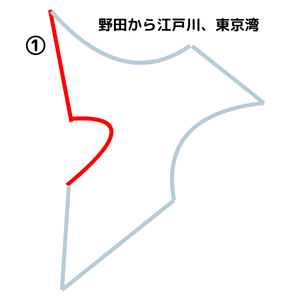 まず、野田から江戸川を書いて、東京湾をぐるっとかくぞ!