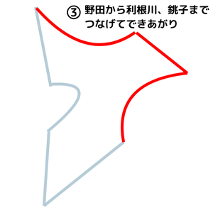 最後に、野田から利根川ぞいに銚子まで、ぐるっとむすべばできあがりじゃ!