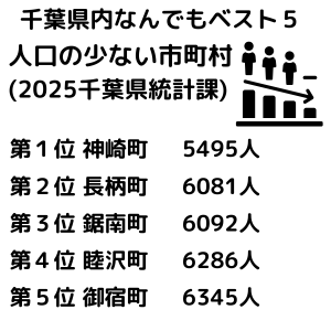 ちなみに、千葉県で1つしかない村である長生村(ちょうせいむら)の人口は12896人じゃ!村の方が町よりも多いんじゃな。